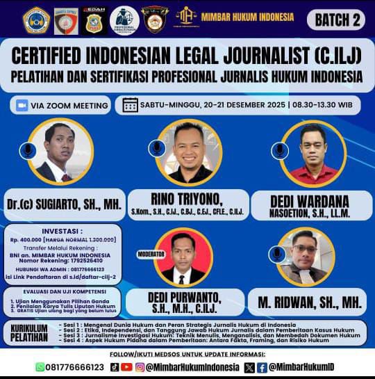 Menjawab tantangan tersebut, Mimbar Hukum Indonesia (MHI) kembali menunjukkan komitmennya dalam membentengi kualitas jurnalisme hukum nasional dengan menyelenggarakan Pelatihan dan Sertifikasi Certified Indonesian Legal Journalist (C.ILJ) Batch 2, yang akan dilaksanakan pada 20–21 Desember 2025.